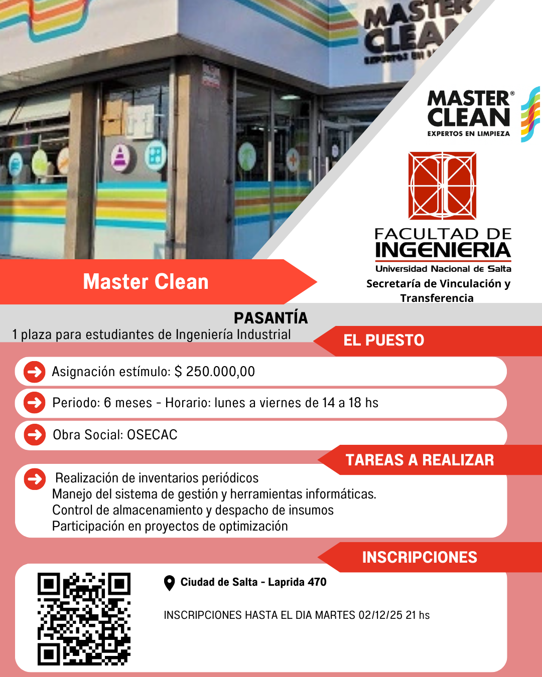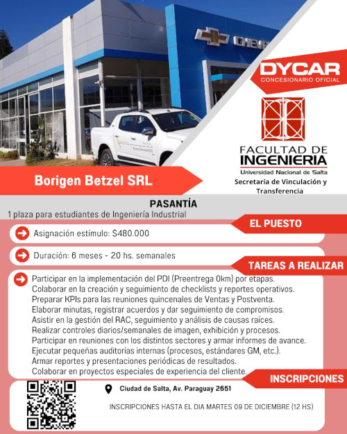 La Decana de la Facultad de Ingeniería de la Universidad Nacional de Salta, mediante Res. 526-D-2025, resuelve, convocar a inscripción de interesados para la cobertura de un (1) cargo de Becario de Formación, destinado a prestar funciones en la Secretaría de Vinculación y Transferencia de la Facultad de Ingeniería, con una retribución mensual equivalente a una Beca de diez (10) horas semanales, por el término de doce (12) meses.