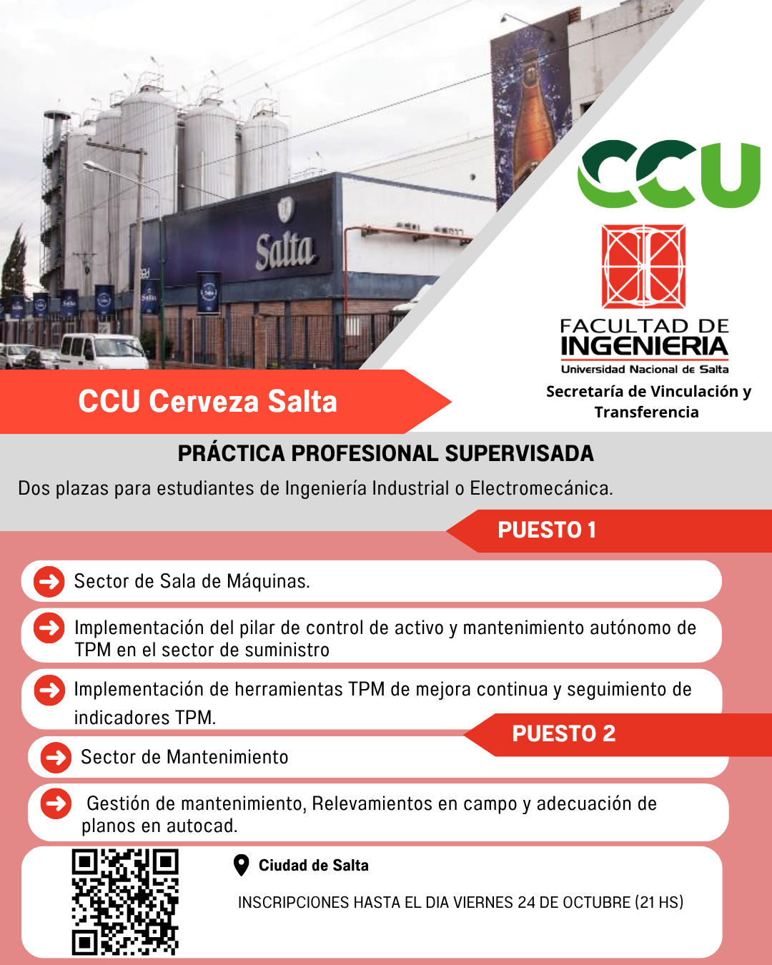PPS: Estudiantes de Ingeniería Industrial o Electromecánica - CCU Cerveza Salta Publicado en Práctica Profesional Supervisada. Bolsa de empleo Estudiantes