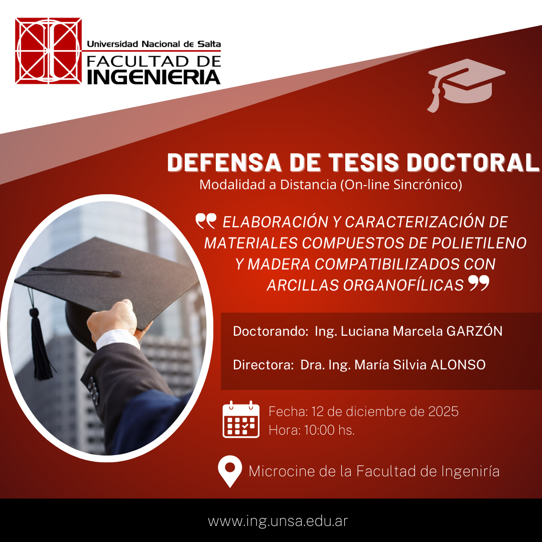 La Decana de la Facultad de Ingeniería de la Universidad Nacional de Salta, mediante Res. 550-DING-2025, resuelve, otorgar aceptación formal al Trabajo de Tesis titulado: “Elaboración y caracterización de materiales compuestos de polietileno y madera compatibilizados con arcillas organofílicas” presentado por la doctorando Ing. Luciana Marcela Garzón, en base a los informes evaluativos del Tribunal de Tesis designado.